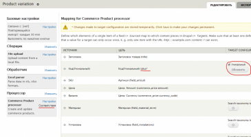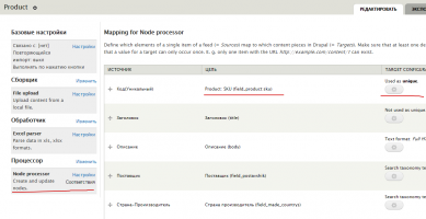 В последнем скрине в качестве уникального значения мы сипольуем SKU - артикул товара. Но в стандартной поставке Feeds это поле не получиться использовать как уникальное - нет там такой возможности. Поэтому на придеться немного написать кода. По полю SKU м будем искать ноды товары и обновлять их.