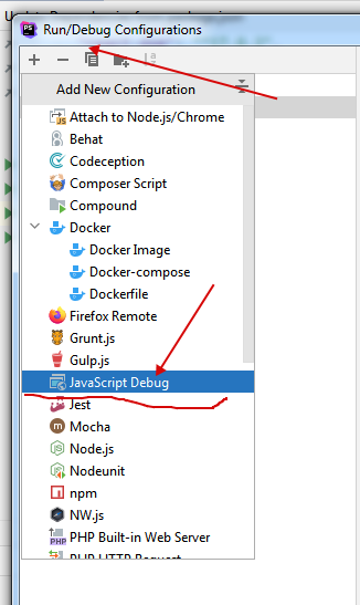 2. Нажимаем "+" и выбираем в списке JavaScript Debug