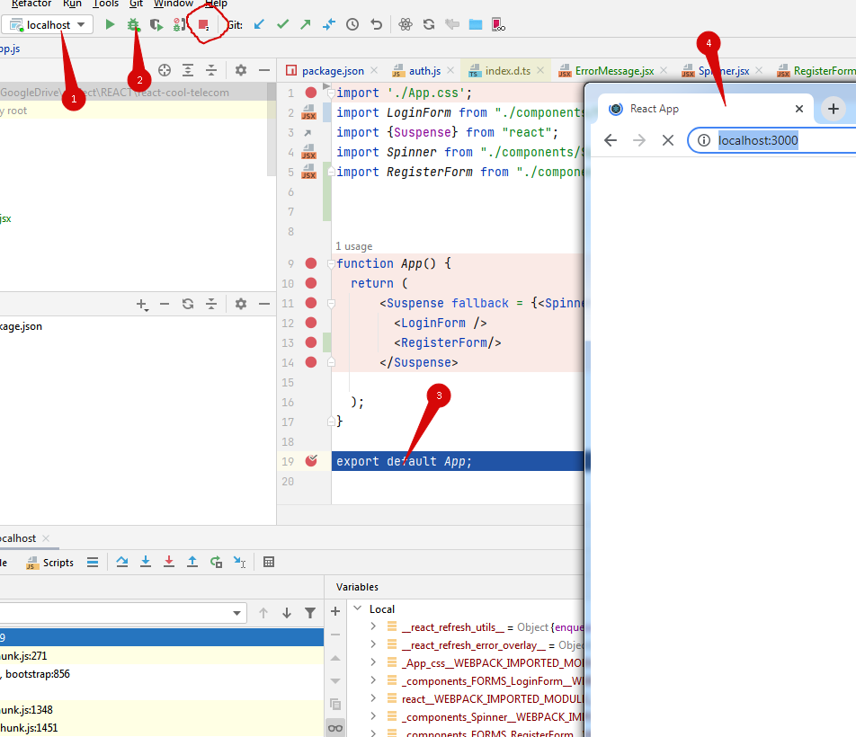 Выставляем флаг "Ensure breakpoints are detected whaen loading scripts" мне помогла тем что точки останова стали отрабатывать прямо в App.js основном файле приложения.