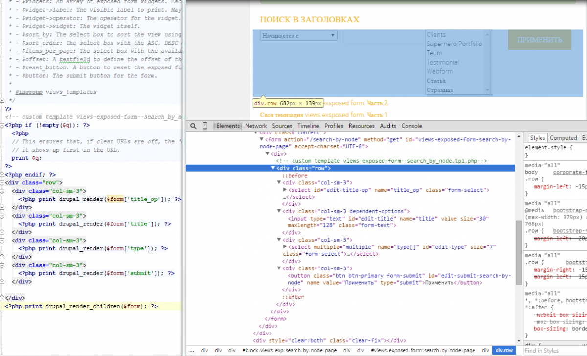 В первой части статьи мы начали разговор о темизации exsposed filter. Основной момент который мы вынесем с первой части, это то что нам нужно создать отдельный шаблон для exposed filters путем копирования шаблона views-exposed-form.tpl.php и переименование его в шаблон вида views-exposed-form--[название представления].tpl.php