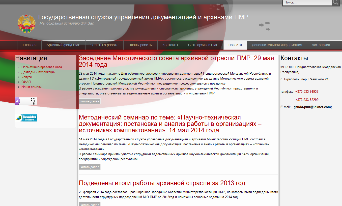 Проект выполнен по заказу "Государственная служба управления документацией и архивами ПМР". В качестве системы управления используется Drupal. Сайт разработан с "нуля".